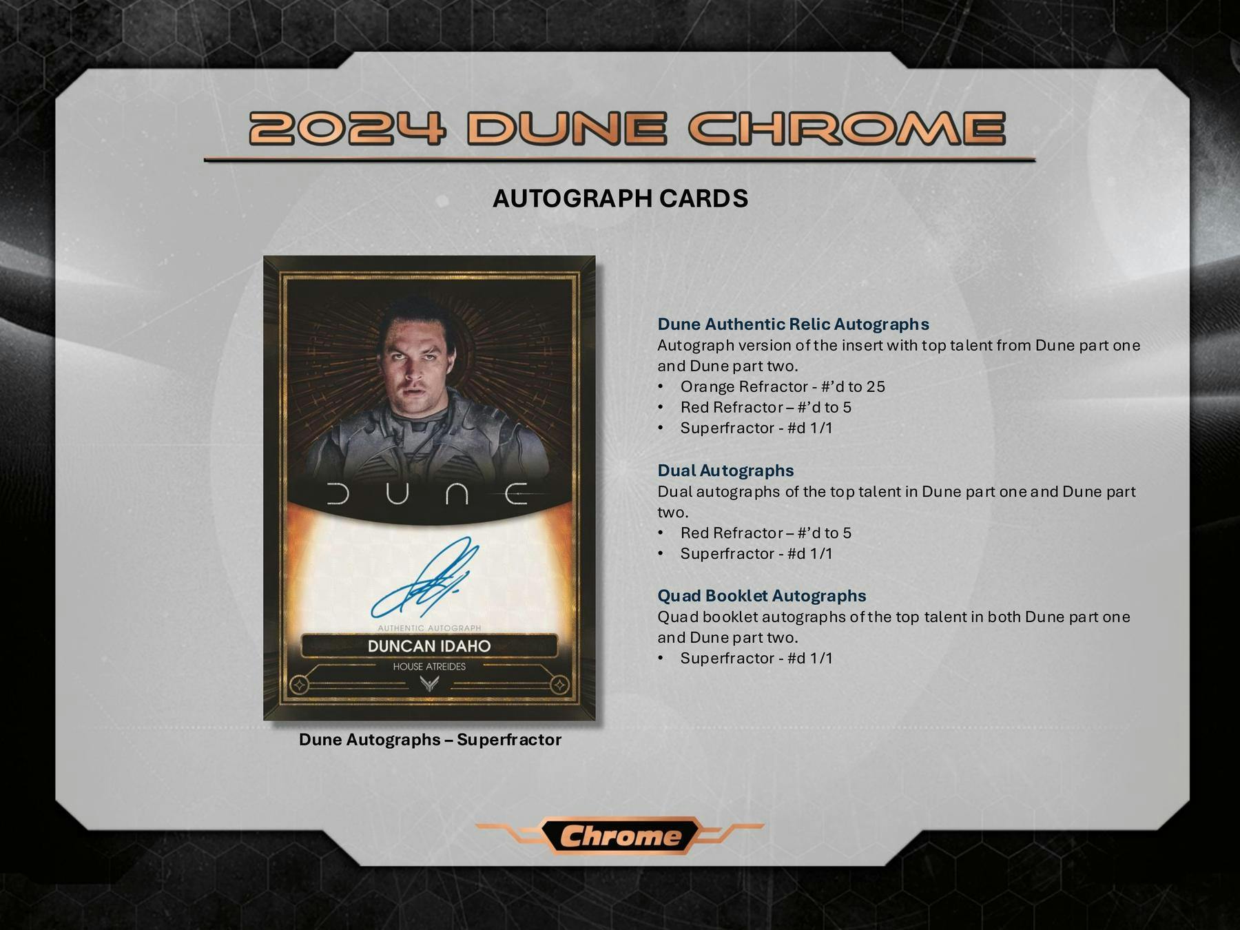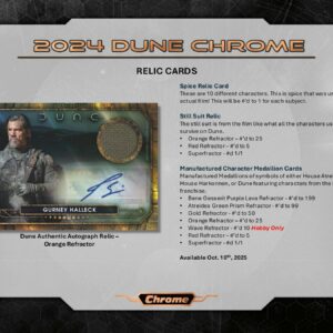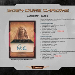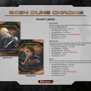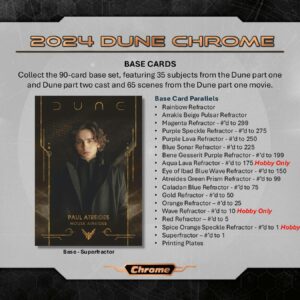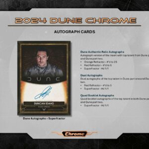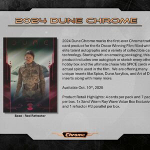 A 2024 Dune Chrome az első Chrome kártya a hatszoros Oscar-díjas filmhez, tele elit tehetségek autogramjaival és különféle gyűjthető kártyatechnológiákkal.