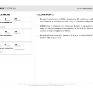 A 2024 Prestige Football a 2024-es NFL Draft néhány legjobb szupersztárjától is egy kasszasiker ellenőrzőlistát kínál autogramokról (többek között a kártyán is),mint minden idők legjobb játékosai.
