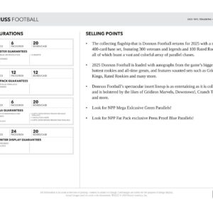 A gyűjtők zászlóshajó, a Donruss Football 2025-ben visszatér egy hatalmas, 400 lapos alapkészlettel, amely 300 veteránt és legendát, valamint 100 Rated Rookies-t tartalmaz, mindegyik hatalmas és színes párhuzamos üldözési kínálattal büszkélkedhet.