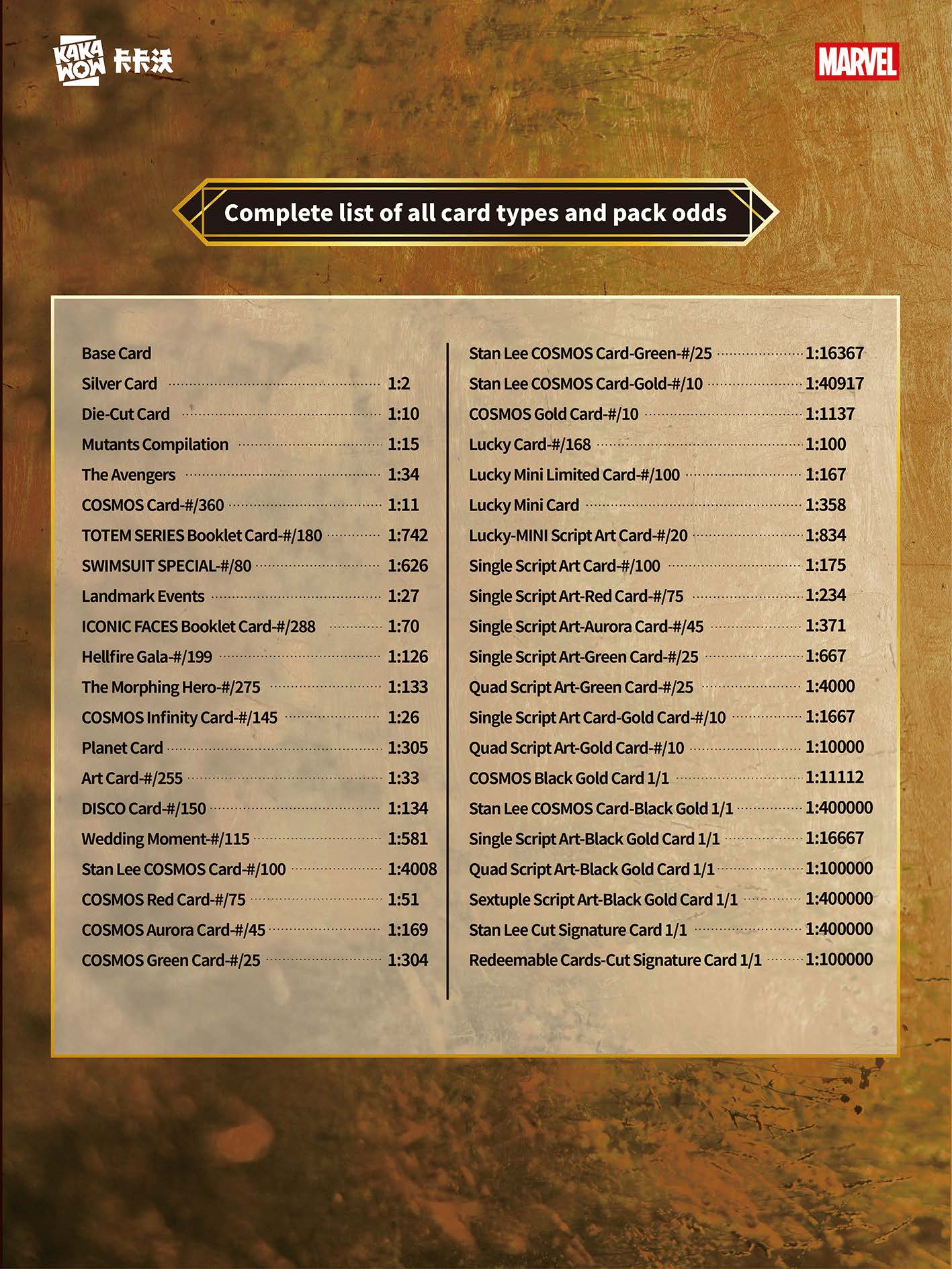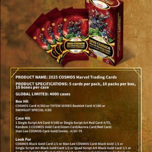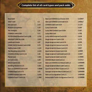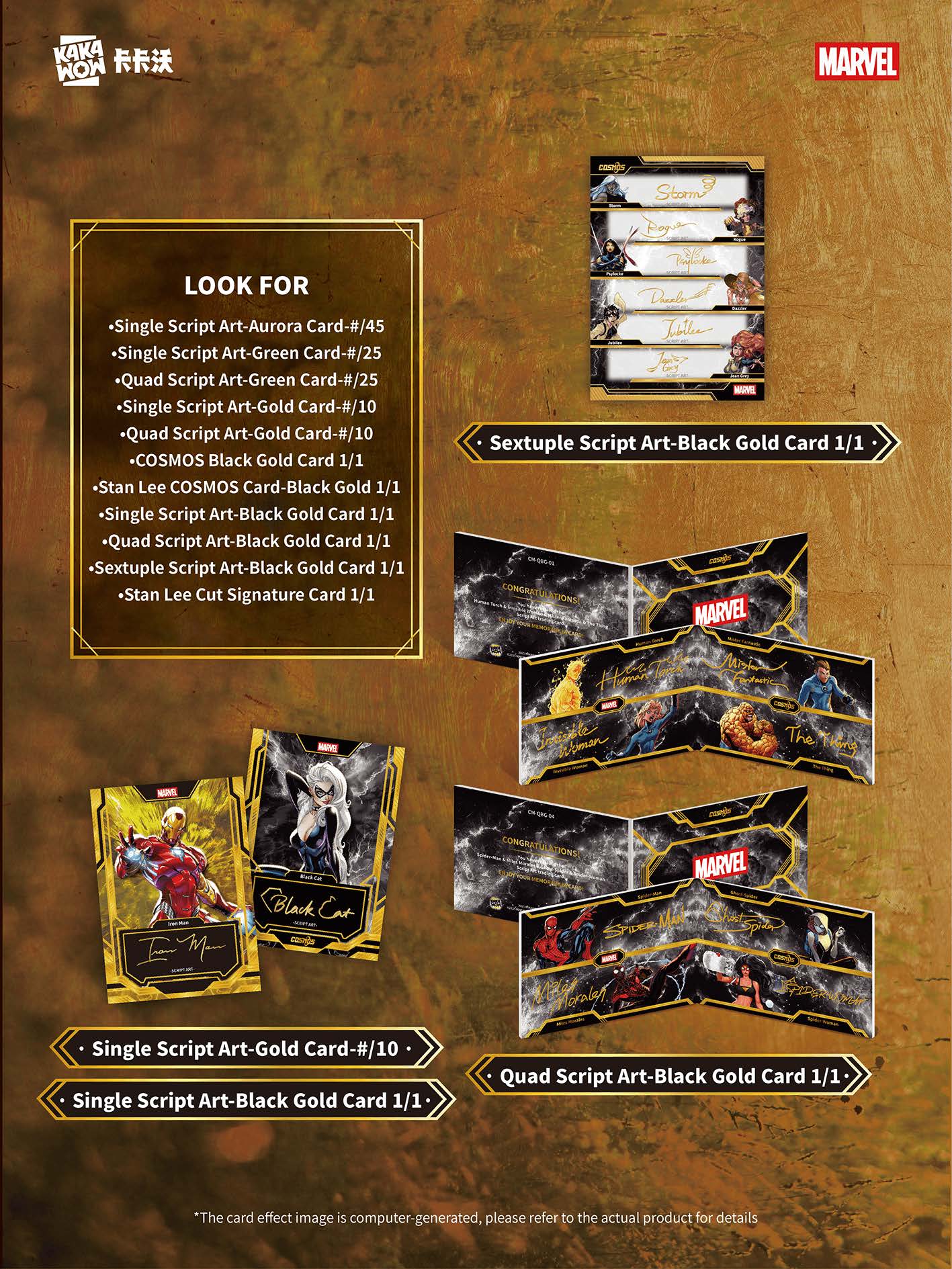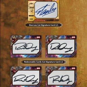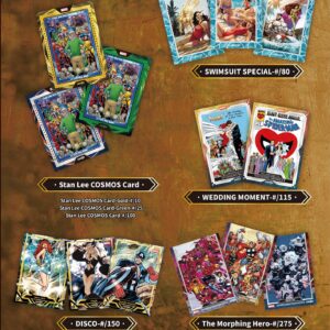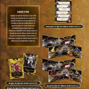 Keresd a COSMOS Black Gold kártyát 1/1, Stan Lee COSMOS kártyát – Fekete Arany 1/1, Egyszeres szkriptes grafika – Fekete Arany kártyát 1/1, Négyszeres szkriptes grafika – Fekete Arany kártyát 1/1, Hatszoros szkriptes grafika – Fekete Arany kártyát 1/1 vagy a Stan Lee Cut Signature kártyát 1/1!