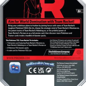 Ezzel a tinnel válaszd a Team Rocket Mewtwo ex stratégiai elméjét, a Team Rocket Nidoking ex erős toxinjait vagy a Team Rocket Persian ex büszke erejét mint fólia promóciós kártya, majd fedezd fel a további Pokemon és edző kártyákat a booster csomagokban.