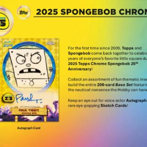 2009 óta először Topps és SpongyaBob újra összeáll, hogy megünnepeljék mindenki kedvenc kis kockafigurájának 25. évfordulóját a 2025-ös Topps Króm SpongyaBob Kockanadrág 25. évfordulójával!