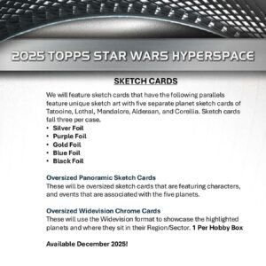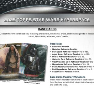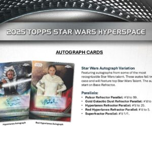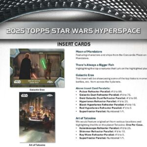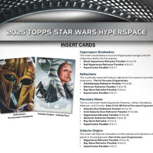 Dobozonként négy számozott kártya és case-enként két Aláírt kártya található, valamint a következő alkészletek egyike: Star Wars Reflections, Planetary Views és Galactic Origins, így dobozonként egy-egy kártya kerül bele.